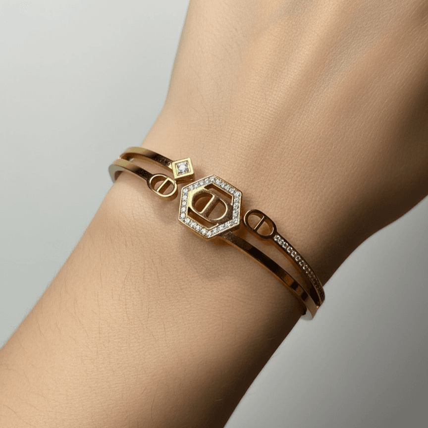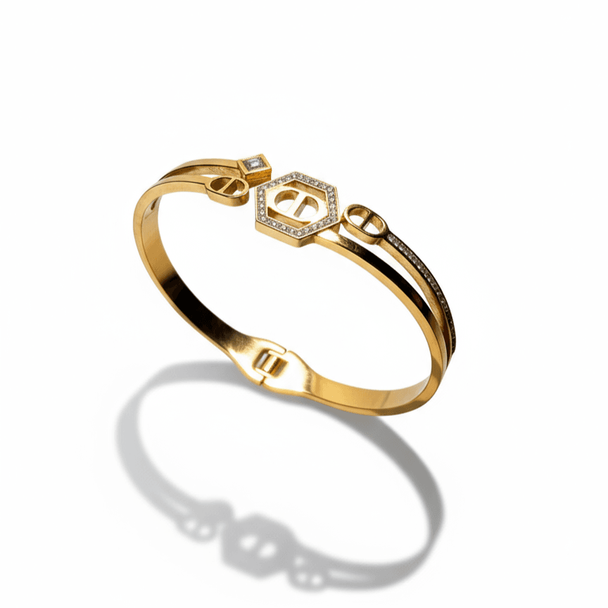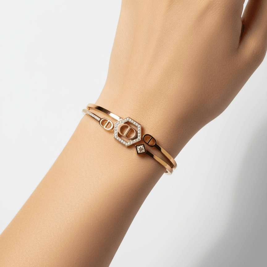 Make a bold, modern statement with the HexaLuxe Geometric Bangle. This contemporary piece stands out with its striking combination of hexagonal and interlocking geometric motifs, set against a radiant gold-tone finish. Sparkling imitation stones add a refined, glamorous touch, while the open, double-band silhouette ensures a sophisticated look that pairs effortlessly with both casual and formal attire. Crafted from premium gold-plated alloy, the bangle is tarnish-resistant and skin-friendly, offering all the appearance of real gold and diamonds with the practicality and value of imitation jewelry. Its unique hinged design ensures an easy and secure fit, making it perfect for anyone who wants to express their style with distinctive, trendsetting accessories.